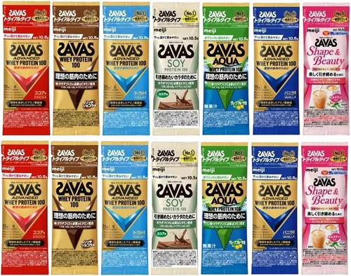 - SAVASの人気シリーズを網羅した、トライアルパック。自分に合うプロテインを探している人におすすめ。